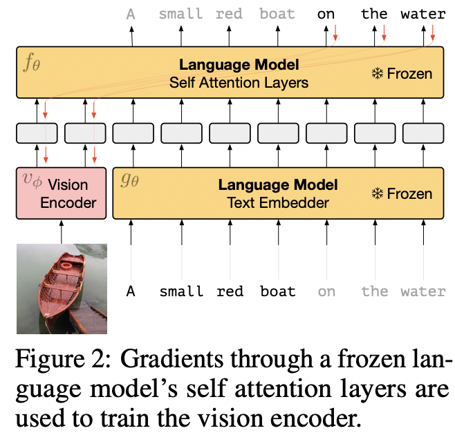 - LM의 가중치는 frozen된 상태로 유지되지만, gradient는 이미지 인코더를 처음부터 훈련시키기 위해 이 LM을 통해 역전파된다
