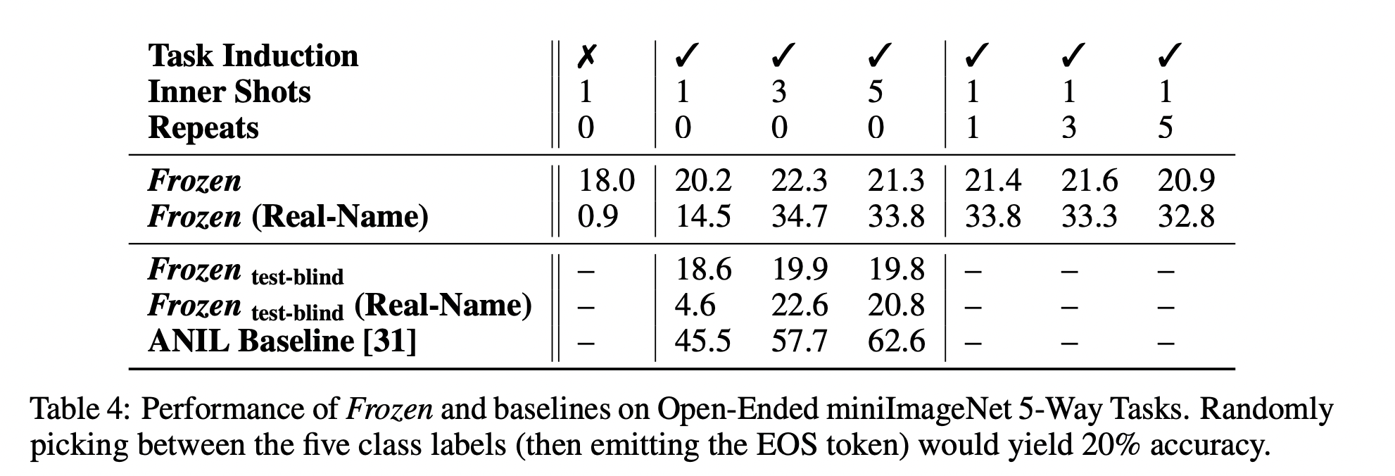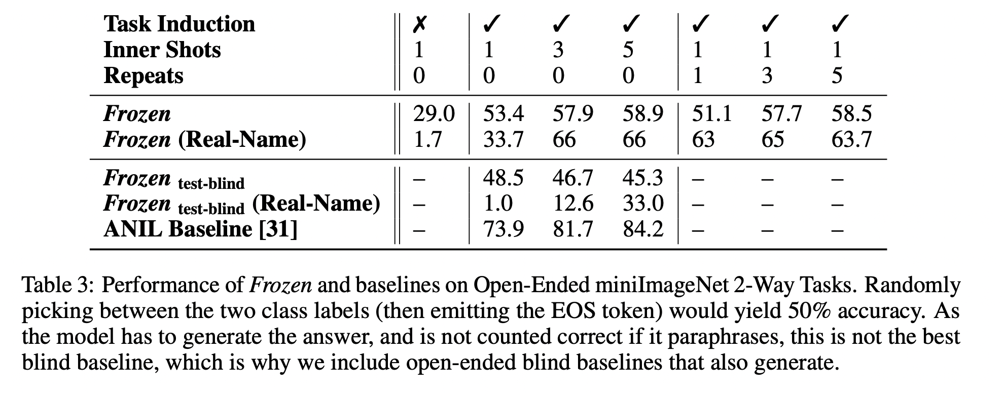 - 우리는 기존의 minImageNet에서는 정답으로 인정받기 위해선 올바른 카테고리 이름(+ EOS token)을 생성해야만 하는 open-ended 방식으로 Frozen를 검증함