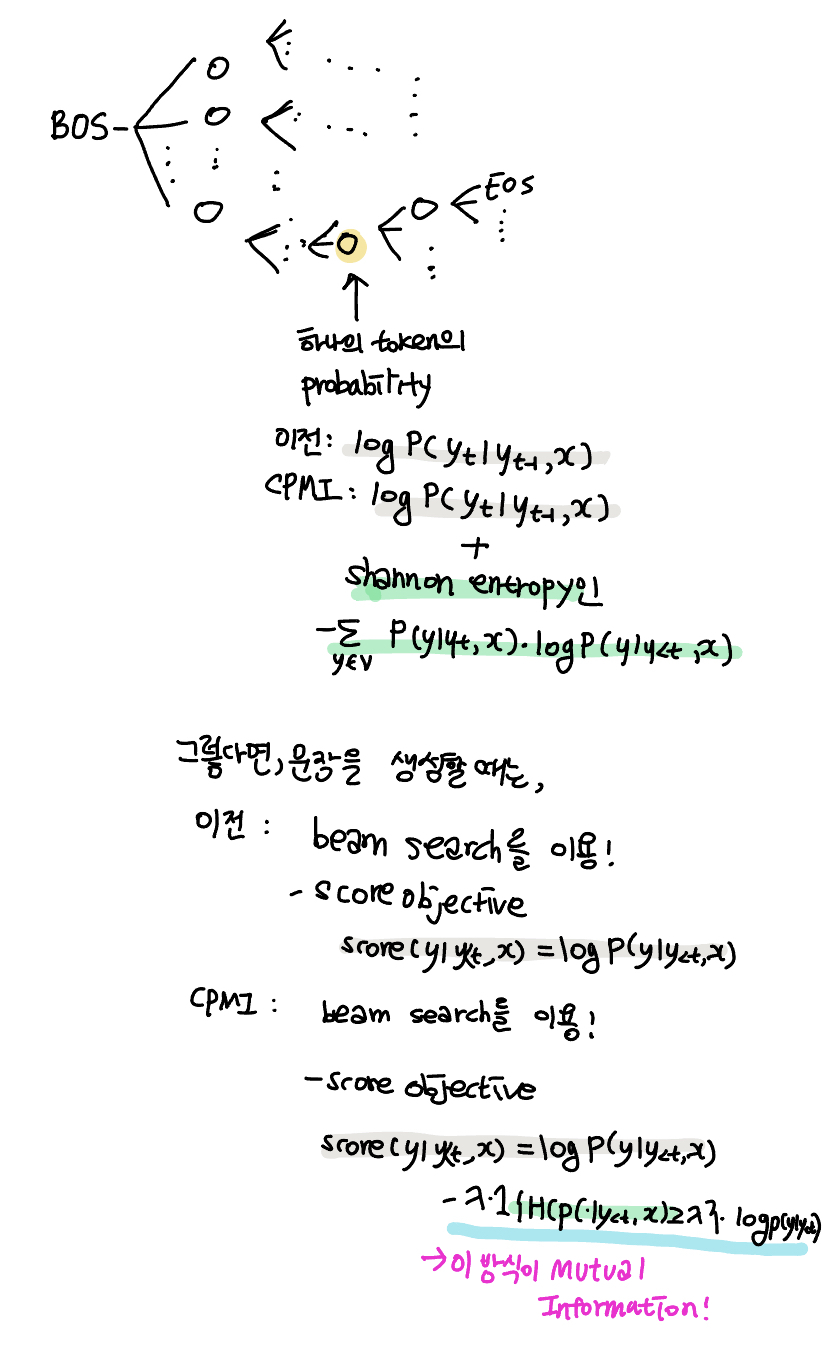 - 따라서 저자들은 모델이 uncertainty을 보일 때, target token의 확률 뿐만 아니라 소스 문서와 target token 사이의 pointwise mutual information(PMI)을 최적화하는 디코딩 전략을 제시 ~