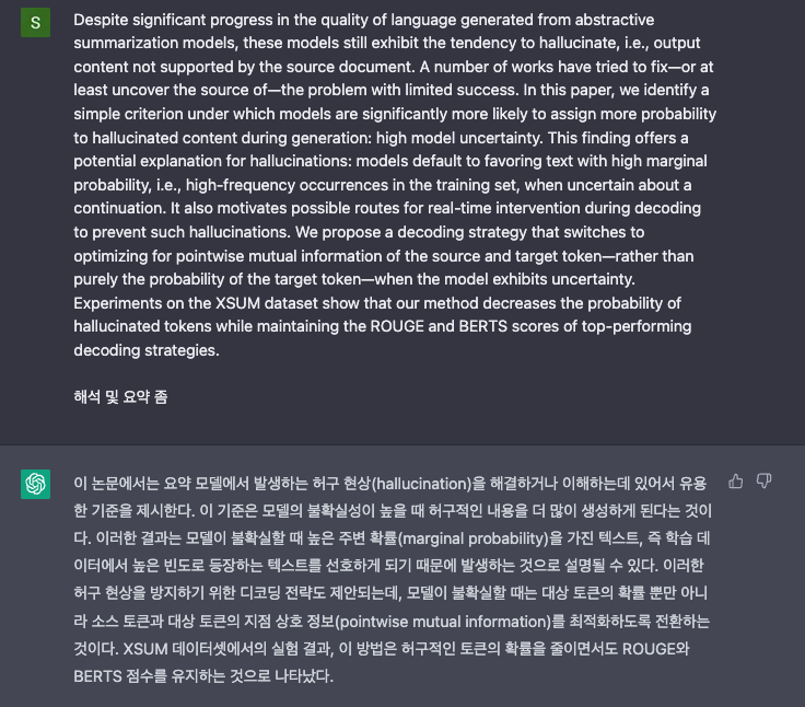 - hallucination : 긴 문서를 짧은 요약으로 생성하는 추상적 요약(abstractive summarization) 작업에서 자주 발생하는 문제