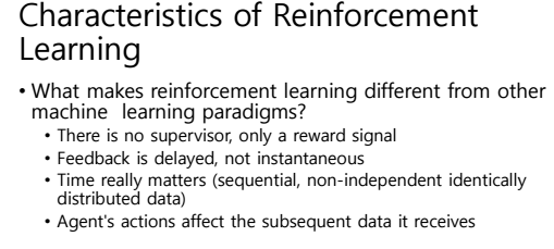 미래 총 rewards가 최대가 되는 action들을 고르는 것이 목표 Action들의 경우 long term consequences들 가질 수 있다 Reward의 경우 지연될 수 있다