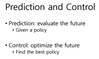 - Prediction은 주어진 policy에 대해서 미래를 evaluate한다