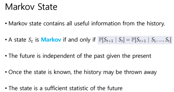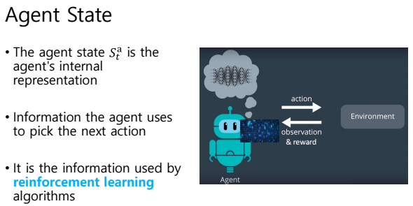 State : 다음에 무슨 일이 일어날지 결정하는 정보 보통 history의 함수가 state다State의 종류