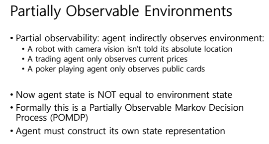 - agent가 Env. State에 대해 간접적으로(indirectly) 관찰할 수 있을 때