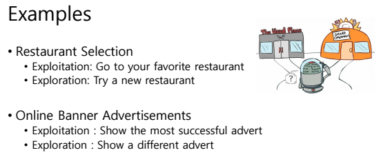 - Exploitation은 내가 이미 알고 있는 정보들 중에서 reward를 최대화하는 방안을 선택하는 것이다