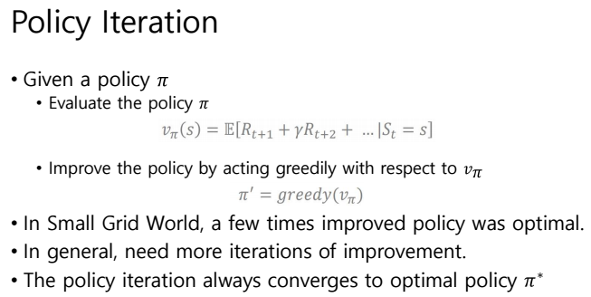 - greedy improvement : 다음 state 중에서 가장 높은 value function을 가진 state로 가는 것, 즉 max를 취하는 것