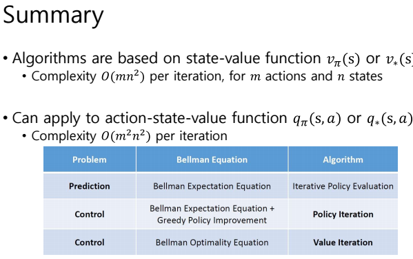 - ⇒ DP는 Planning 방식으로, MDP<S,A,P,R,r>에 대해 모든 것을 알고 있다는 전제 하에, 두 단계로 나누어 1) Prediction과 2) Control 단계를 거쳐 수행된다!