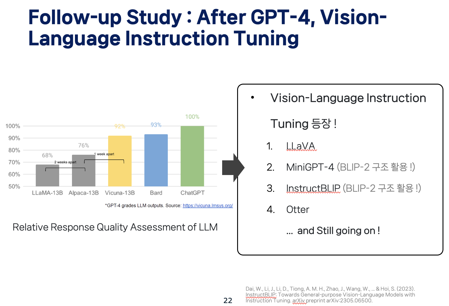 Preliminary evaluations based on GPT 4, summarized in Figure 1, show that Vicuna achieves 90%* capability of Bard/ChatGPT. 올해 3월 GPT-4 공개 이후, LLaMA, Alpaca, Vicuna 등 정말 많은 LLM들이 등장했습니다. 그리고 GPT-4는 instruction tuning 방식을 사용하였는데요. 이런 LLM의 발전은 멀티모달 분야에도 큰 영향을 주고 있습니다.