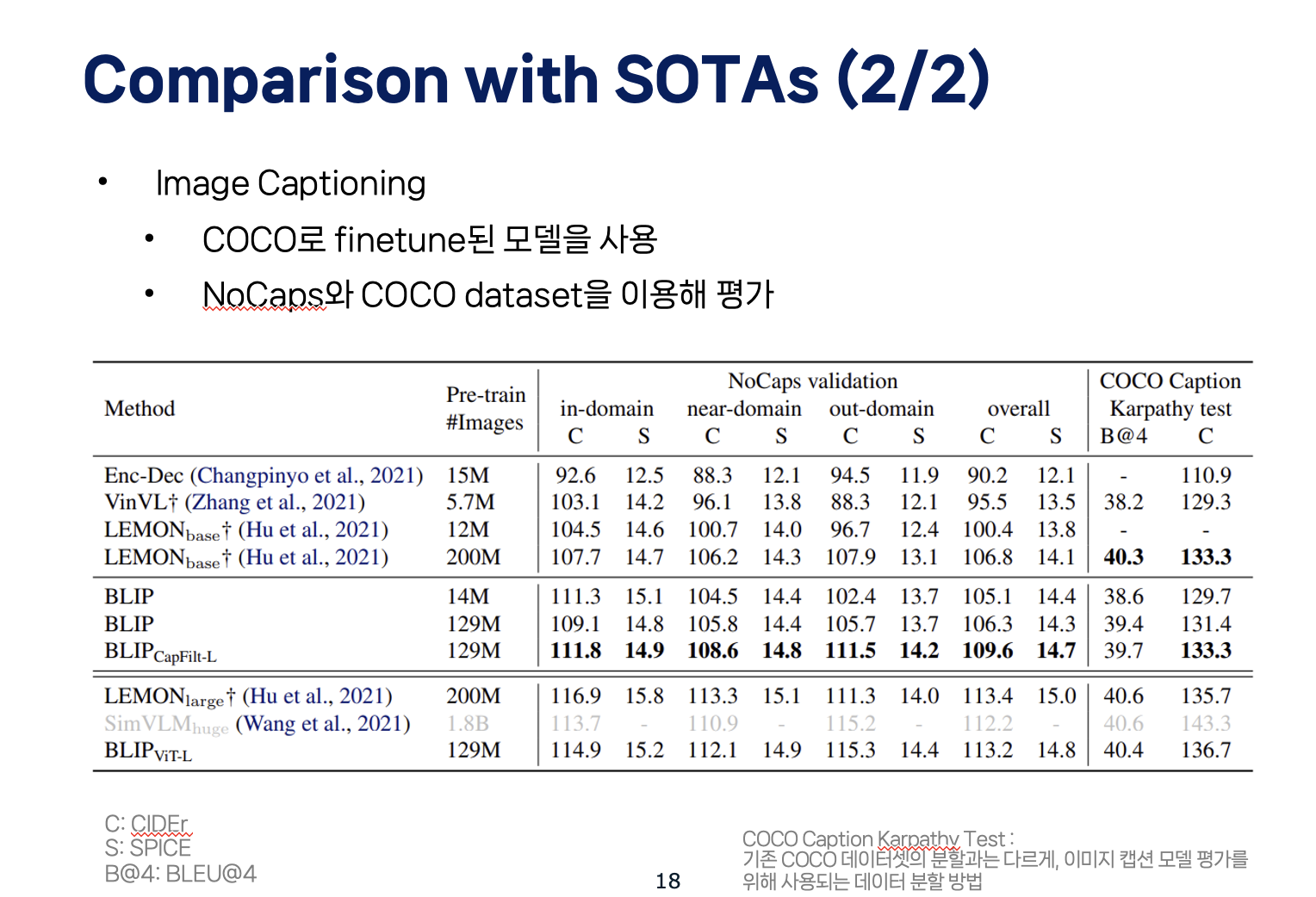 *) "Karpathy test split"은 Andrej Karpathy가 그의 PhD 논문 및 블로그 포스트에서 제안한 특정한 이미지 캡션 관련 학습/검증/테스트 데이터 분할 방법을 지칭합니다. 이 데이터 분할은 원래 COCO 데이터셋의 분할과는 약간 다르게, 이미지 캡션 모델을 평가하기 위해 널리 사용되고 있습니다.