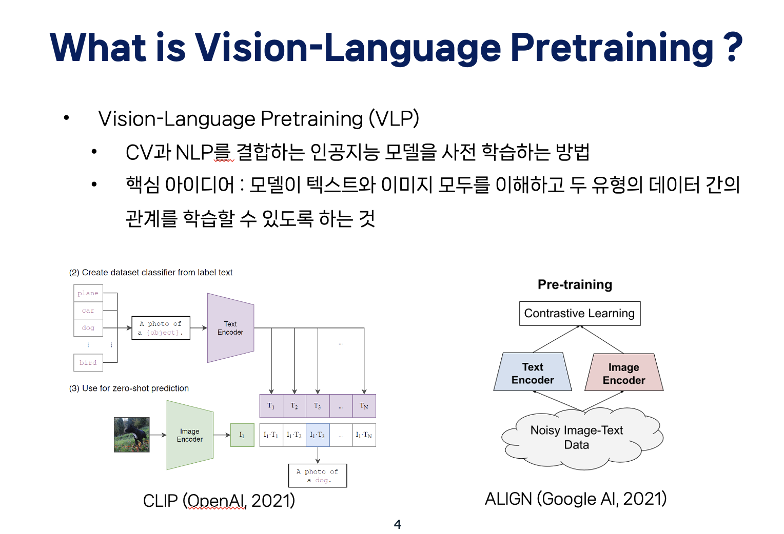 이 점에서 착안 및 활용을 해서 Computer vision 분야에도 적용하려는 시도들이 생겨났고, 그런 첫 시도로 잘 알고 계시는 CLIP이 제시되었습니다. CLIP과 Align 등 VLP 연구들의 가장 핵심 아이디어는 모델이 텍스트와 이미지 모두를 이해하고 두 유형의 데이터 간의 관계를 학습할 수 있도록 하는 것입니다. 이 두 방법들은 이제 text encoder와 image encoder에서 나온 값들에 contrastive learning을 적용하는 방식입니다.
