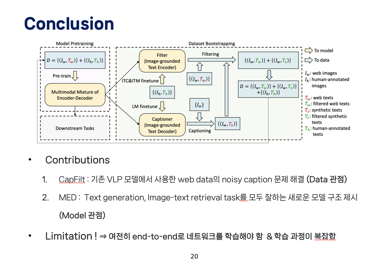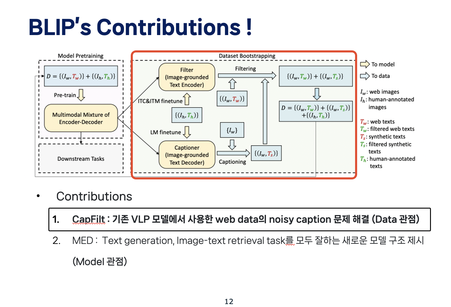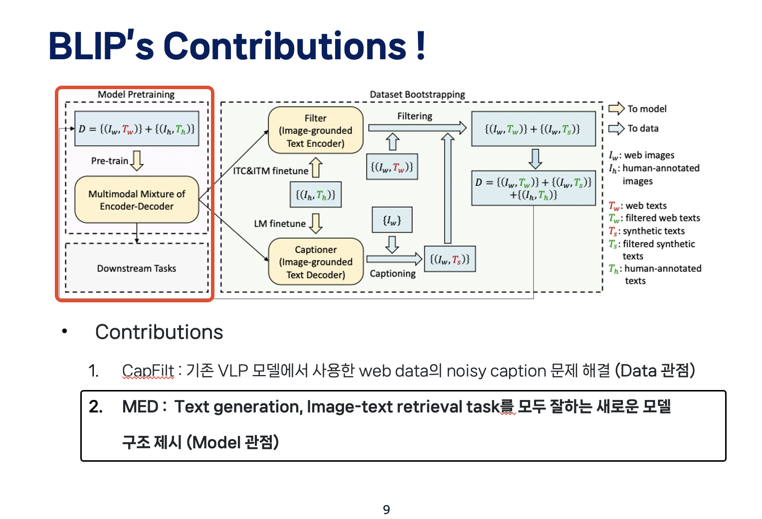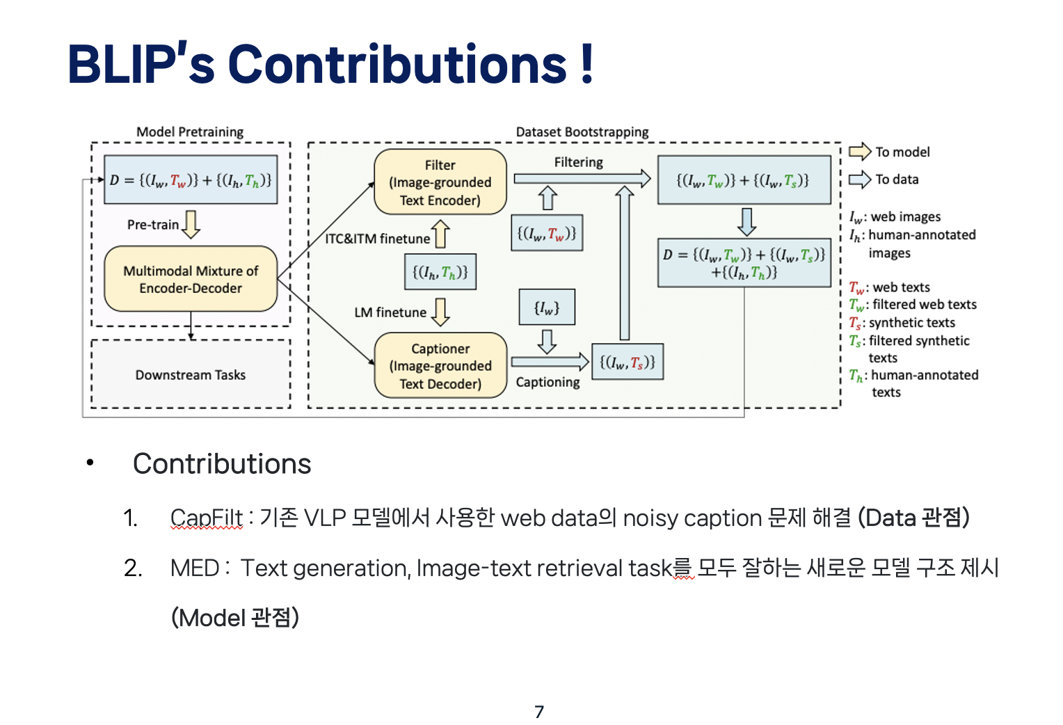 따라서, 앞의 두 한계점을 개선한 BLIP의 main contribution은 크게 두 가지가 있겠습니다.