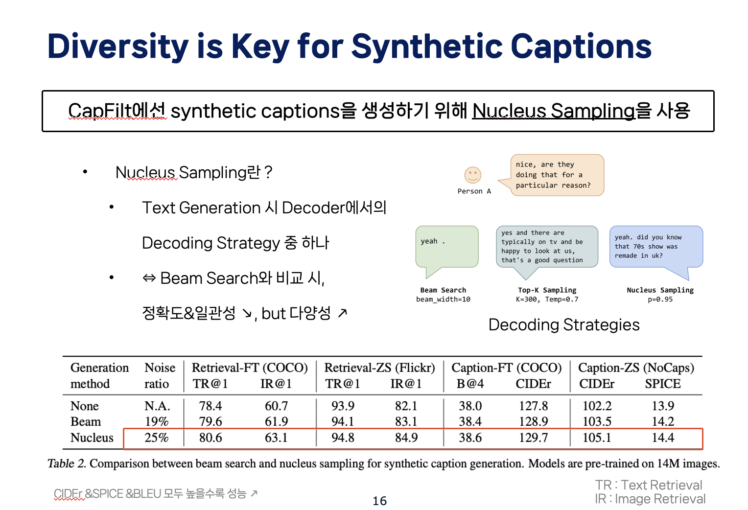 본 논문에서는 CapFilt에서 nucleus sampling를 사용했을 때 더 좋은 성능을 보였음을 증명했습니다. 이는 Nucleus sampling가 더 다양성이 높은 captions을 생성해 모델이 득을 볼 수 있는 더 많은 새로운 정보를 보유하기 때문이라고 저자들은 해석했습니다.