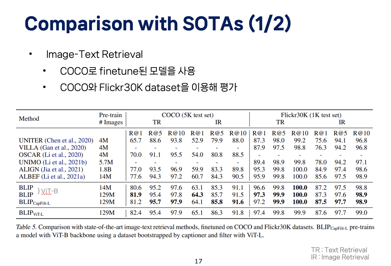 본 논문에서는, COCO에 finetune된 모델을 사용해 Flickr30K와 COCO로 Image Text Retrieval 성능을 평가합니다.