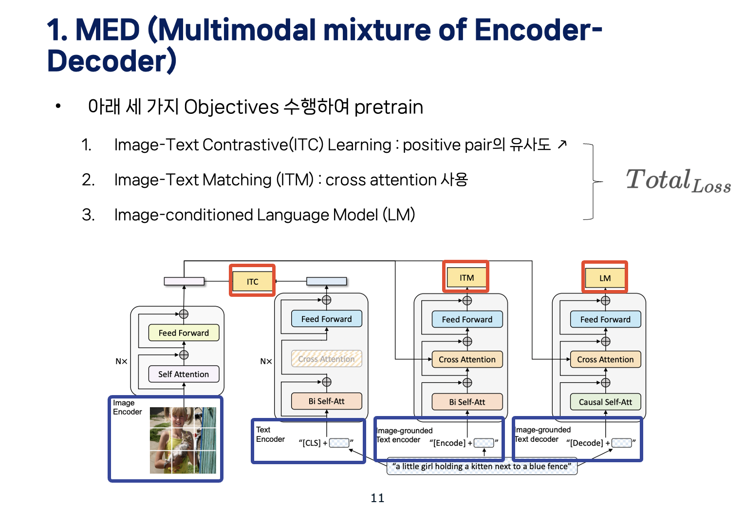 BLIP의 architecture는 아래 세 가지 Objectives를 수행하여 pretrain됩니다