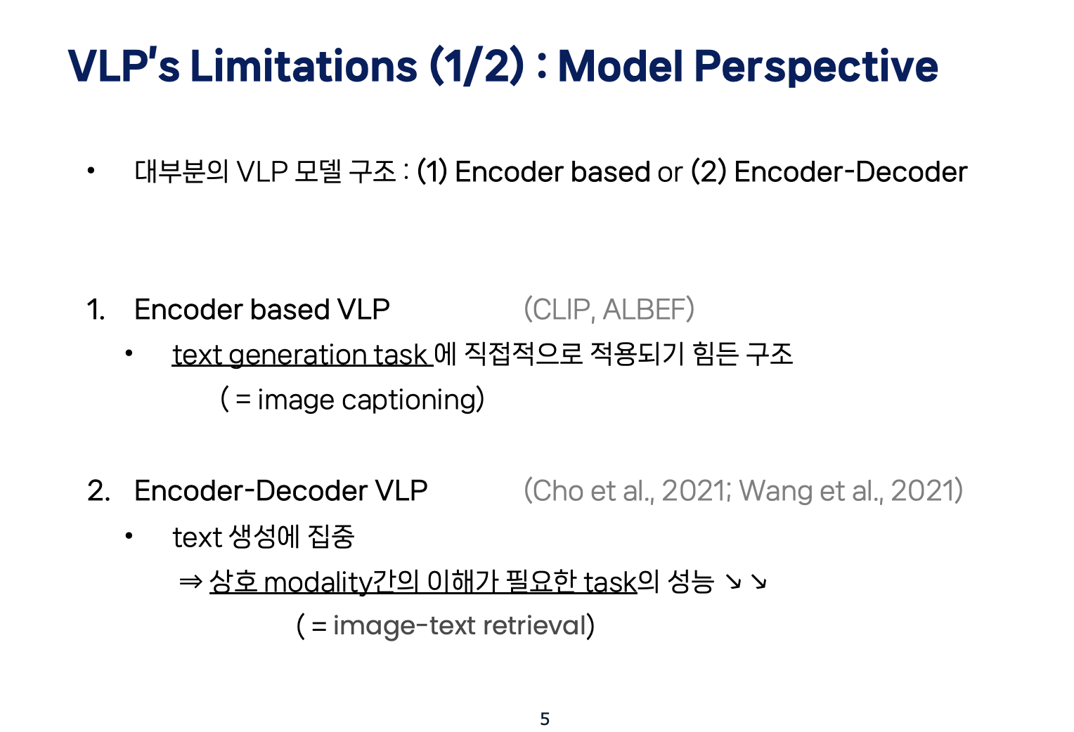 두번째로, 기존의 encoder-decoder 방식은 image-text retrieval같이 상호 modality간의 이해가 필요한 task의 성능이 좋지 못했습니다.
