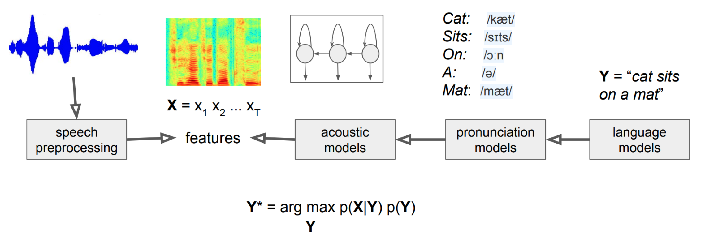 - 음성 신호 X( x1,x2,…,xt)에 대해 가장 그럴듯한(likely) 음소/단어 시퀀스 Y( y1,y2,…,yn)를 추정