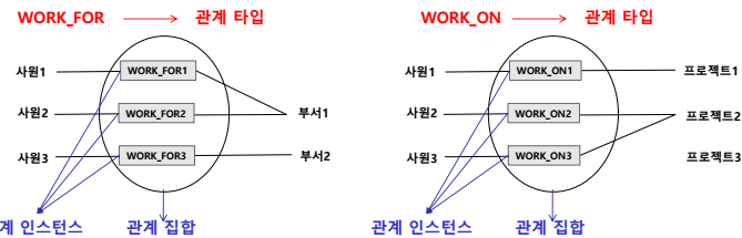 - 관계 인스턴스들의 집합 (관계 인스턴스 : 서로 연관된 특정한 개체 인스턴스 사이의 연관성)