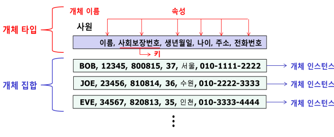 - 각 개체는 자신의 속성에 해당하는 값을 가짐
