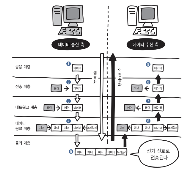 - 캡슐화란 통신 프로토콜의 특성을 포함한 정보를 Header에 포함시켜서 하위 계층에 전송하는 것