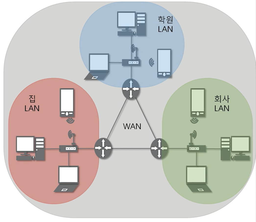 - WAN (Wide Area Network) : 두 개 이상의 LAN 연결 -> 더 넓은 범위를 연결한다