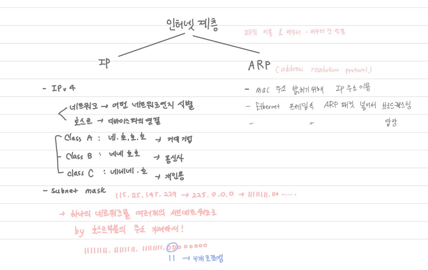 - IP (Internet Protocol), ARP (Address Resolution Protocol) 등이 해당된다