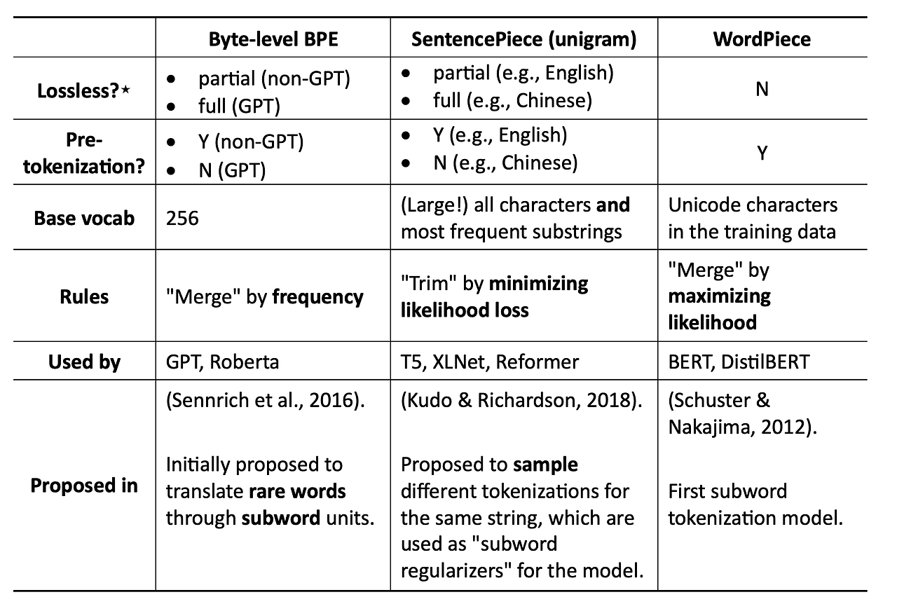 (BytePair, Byte-level BPE, WordPiece, Unigram, SentencePiece)