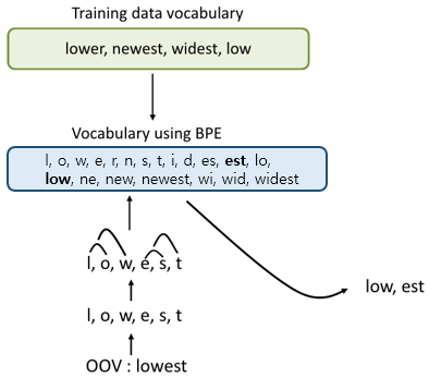 - 어휘 집합 구축 : 자주 등장하는 문자열를 병합하고 이를 어휘 집합에 추가합니다. 이를 원하는 어휘 집합 크기가 될 때까지 반복합니다.
