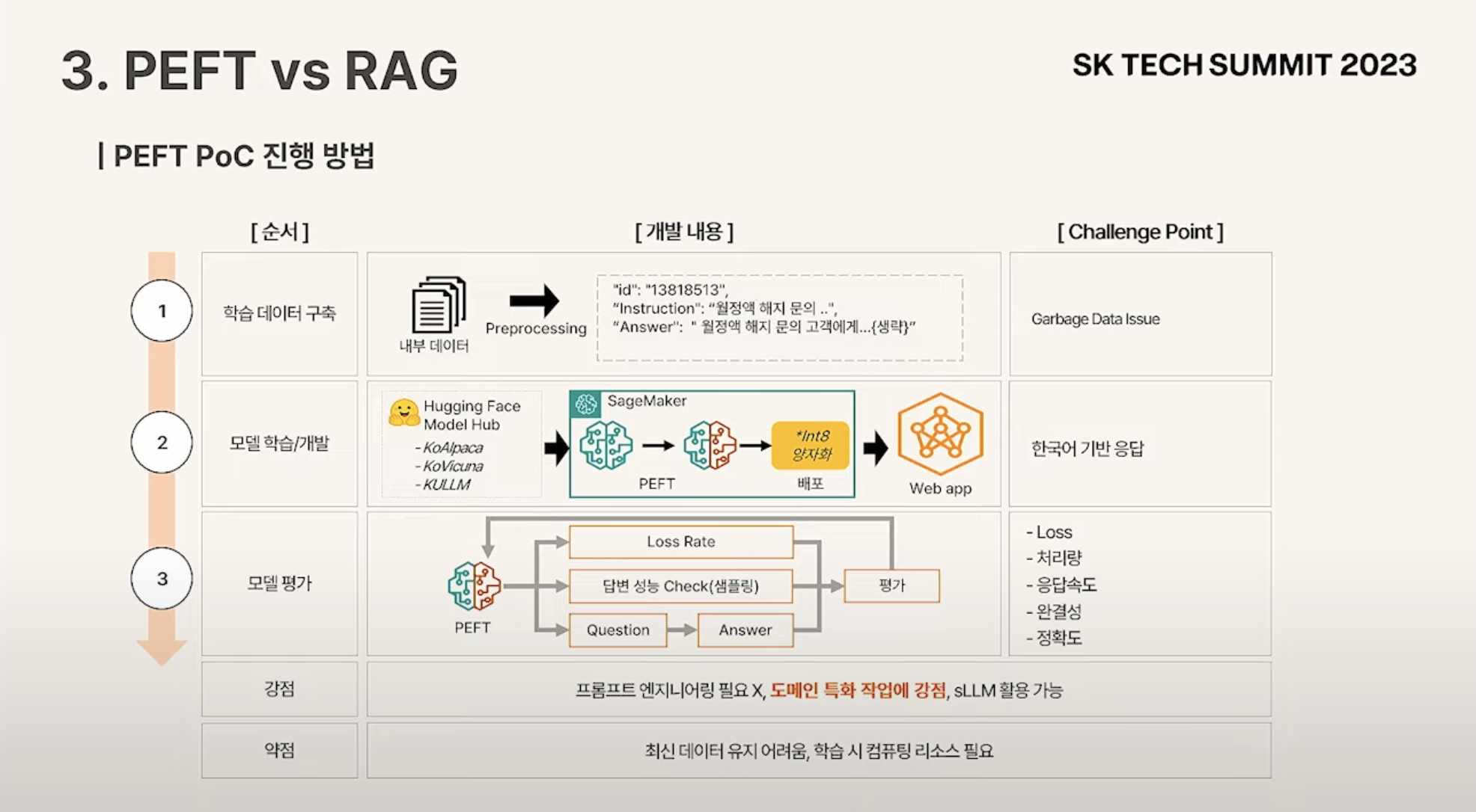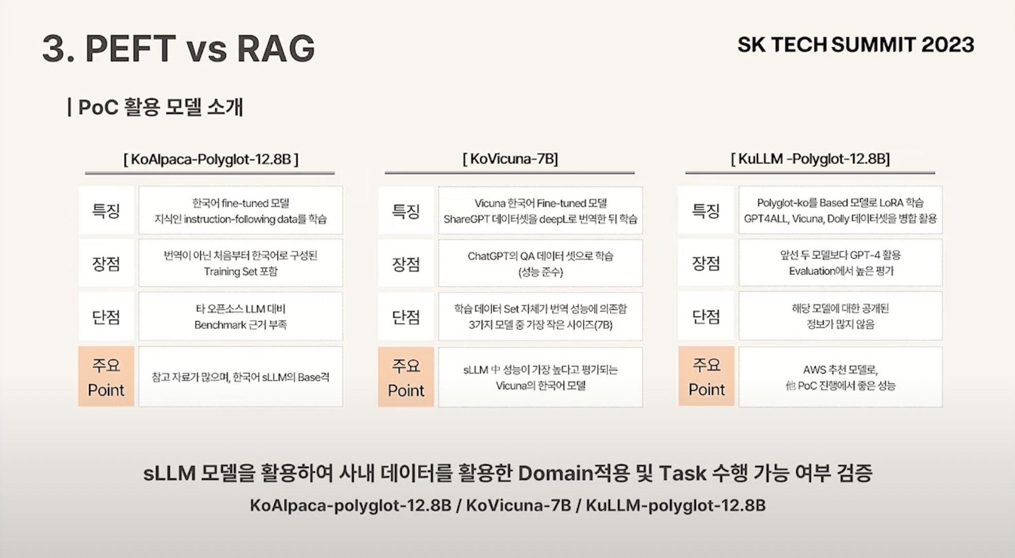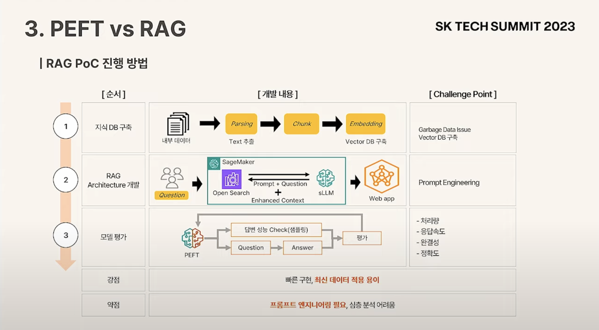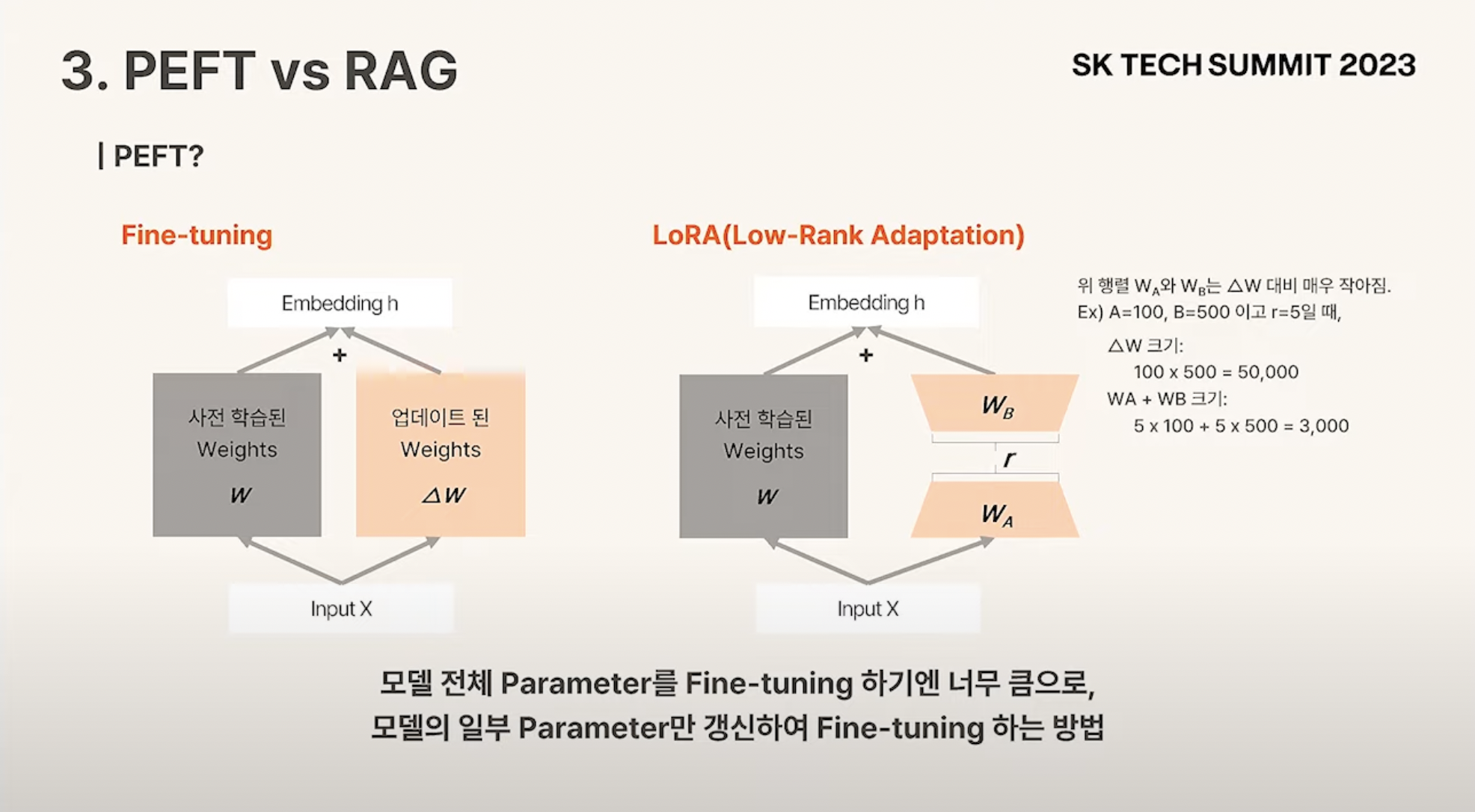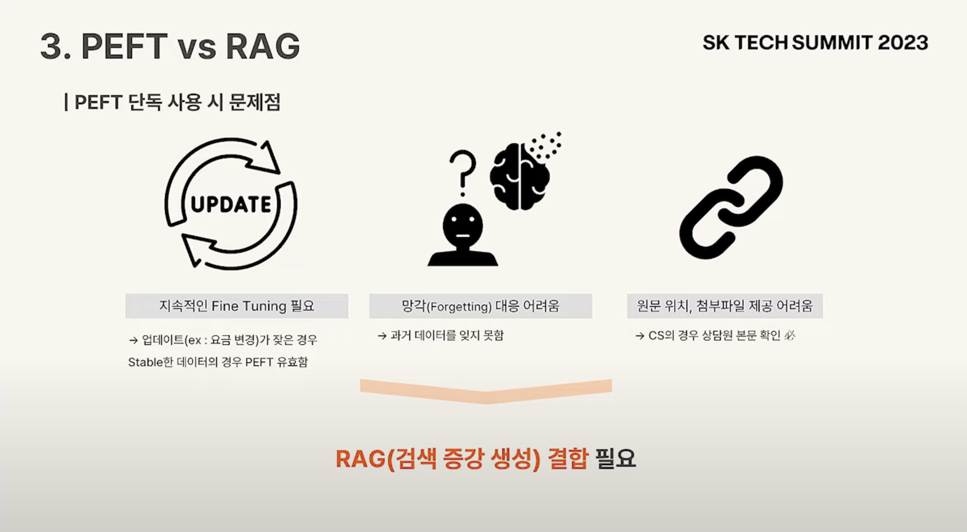 "[SK TECH SUMMIT 2023] LLM 적용 방법인 RAG VS PEFT, Domain 적용 승자는?"