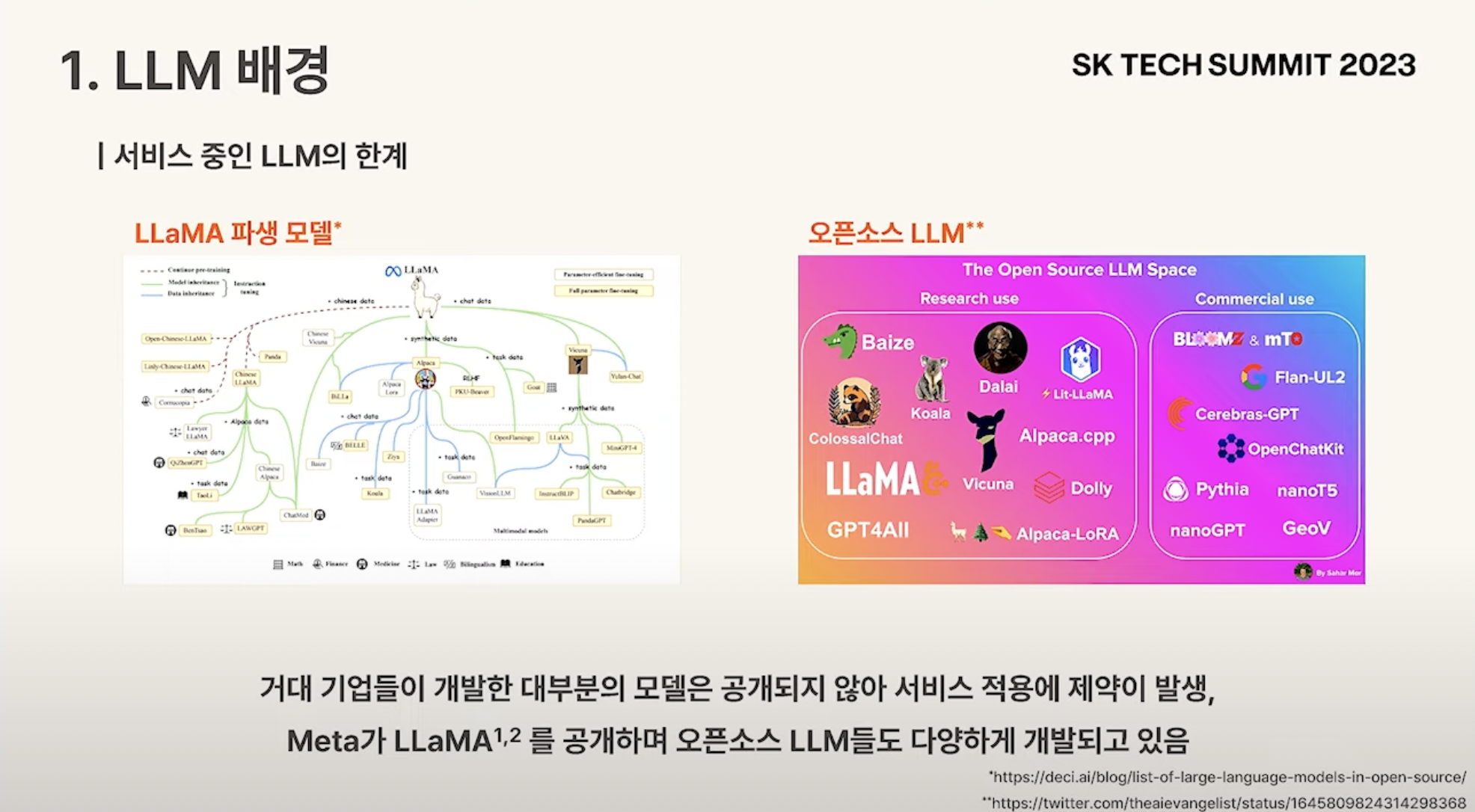 - OpenAI GPT의 경우 API 형태로만 공개해서 사용 시 제약사항이 있었지만, LLaMA를 오픈소스로 풀어서 우리가 잘 쓰고 있는 중 (땡스투Meta)