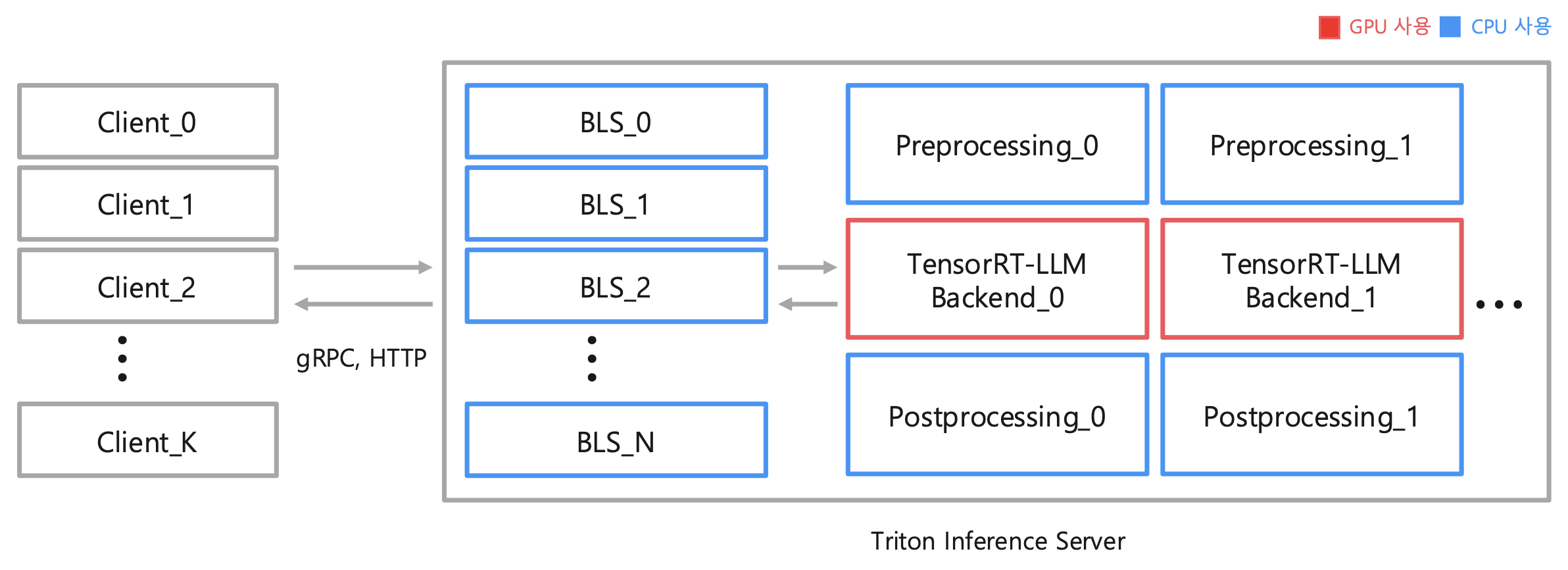 - BLS: preprocessing - tensorrt_llm - postprocessing을 하나의 chain으로 구성
