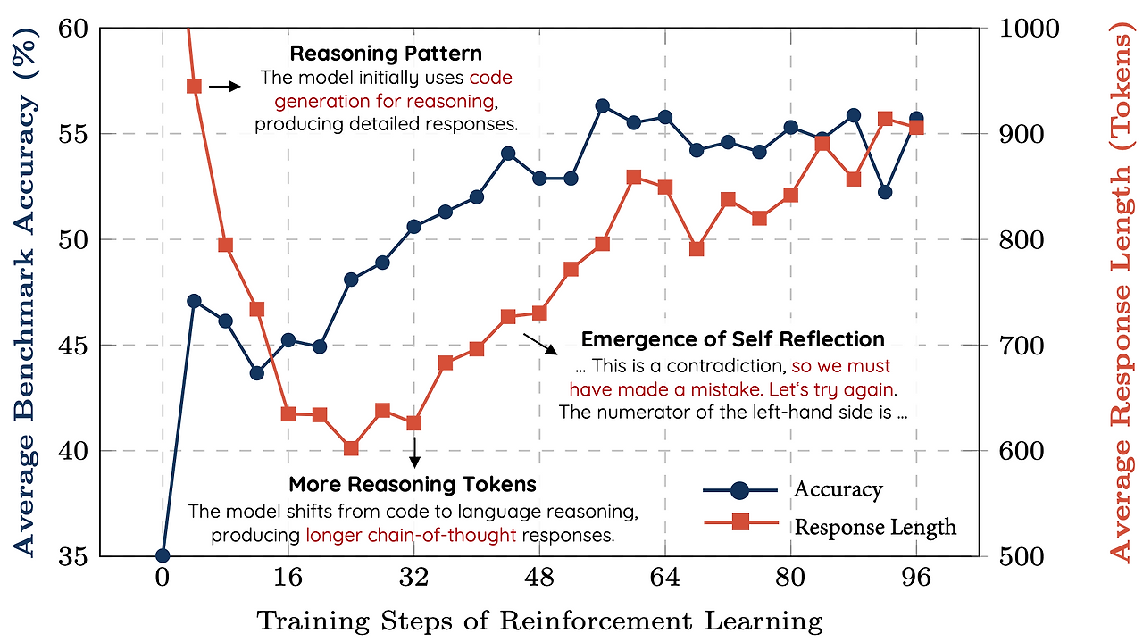 - RLHF 방식으로 모델을 강화학습 후, 모델은 자연어 생성 단계에서 답의 정답과 길이가 다시 길어지는 경향이 있음. 이는 모델이 플래닝, 추론, 리플렉션(self-reflection) 기능을 사용하기 때문임.