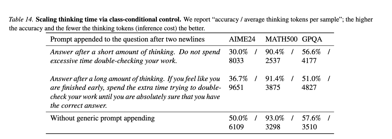 - 첫째, 모델이 일정한 토큰 수 이상을 생성할 때까지 사고 과정을 유지하도록 설정하여, 모델이 충분한 사고를 거친 후 답을 생성하도록 유도
