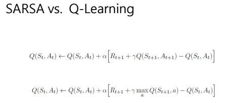 - SARSA의 TD target 부분과 Q-Learning의 TD target부분의 차이 주목!
