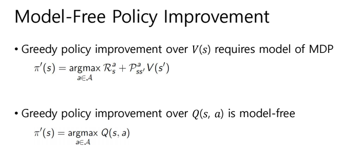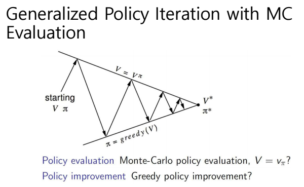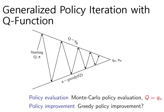 - 문제점: 위의 Monte Carlos Policy Iteration에서 사용한 value function은 policy improvement할 때 문제 생김!