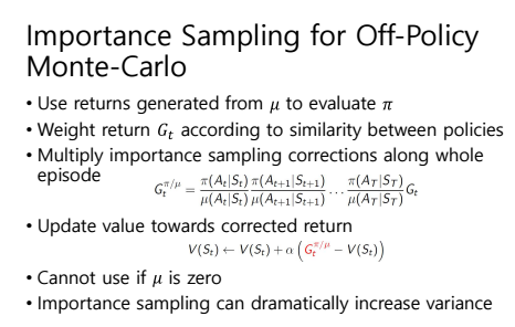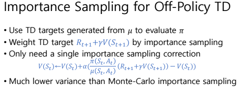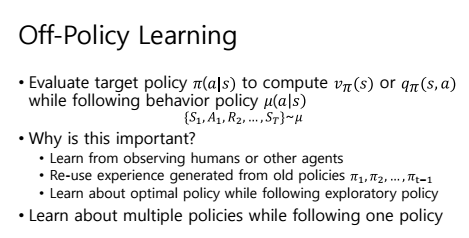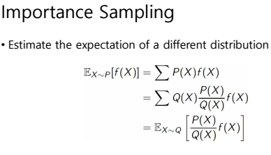 - p와 q라는 다른 distribution이 있을 때 q라는 distribution에서 실제로 진행을 함에도 불구하고 p로 추정하는 것처럼 할 수 있다!→ value function = expected future reward를 계속 추정해나가는데 P(X)라는 현재 policy로 형성된 distribution으로부터 학습을 하고 있지만, 다른 Q라는 distribution을 따르면서도 똑같이 학습할 수 있다!