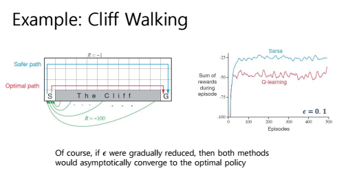 자신이 직접 체험한 그 결과가 아니라greedy한 policy로 인한 Q function을 이용해서 업데이트 → Cliff 근처의 길도 Q-learning은 optimal path라고 판단할 수 있다!