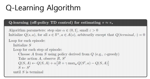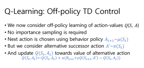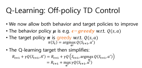 - Q-Learning(Off Policy TD Control)의 경우 TD target R_t+1 + $\gamma$maxQ(S_t+1, a)