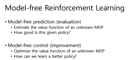 - MDP model을 몰라도 experience는 sampled될 수 있으며, MDP Model을 알아도 sampling이 없으면 방대한 양을 다 계산해야만 하기 때문에