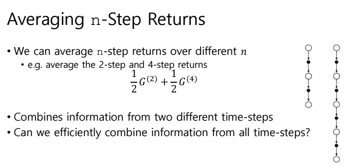 ⇒ 해결책: 여러 n-step TD를 합하면 각 n의 장점을 다 취할 수 있다!