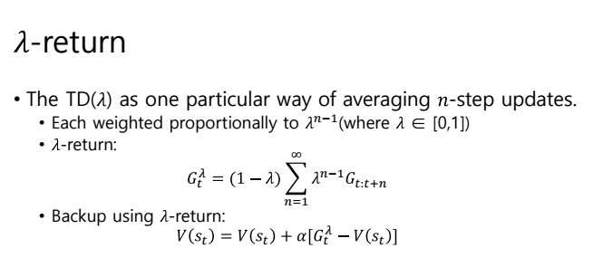 - TD(λ) 식에서 Weighting의 정도는 1- λ이며, step이 진행될수록 λ만큼 decay 되는 것으로 해석할 수 있다