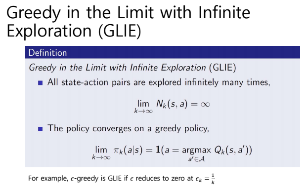 - GLIE란 Greedy in the Limit with Infinite Exploration을 뜻하며, 학습을 해나감에 따라 **충분한 탐험(exploration)**을 했다면 greedy policy에 수렴하는 것을 의미