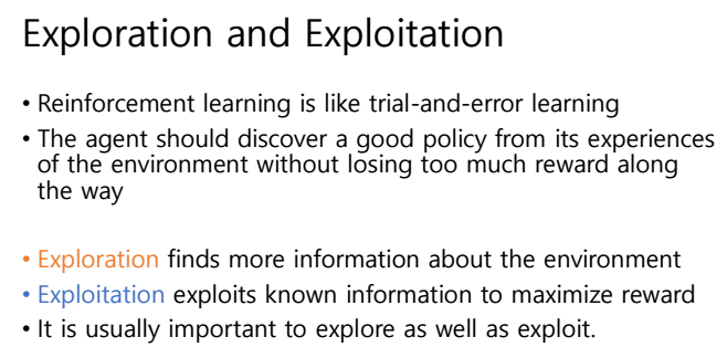 → But, 현재 알고 있는 정보에 대해 greedy로 policy를 정해버리면 optimal에 가지 못 할 확률이 커지기 때문에 탐험이 힘들다!