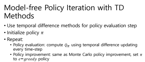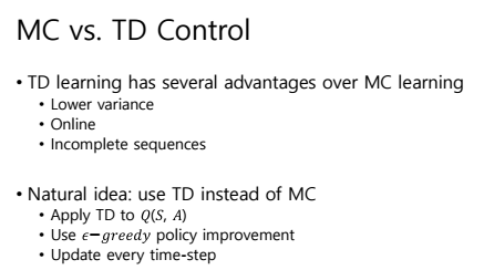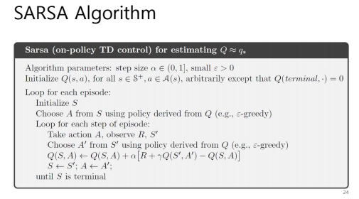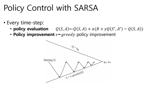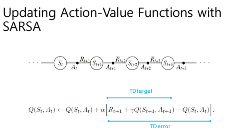 - SARSA(On Policy TD Control)의 경우 TD target R_t+1 + $\gamma$Q(S_t+1,A_t+1)