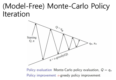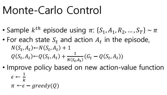 - Monte-Carlo에서도 마찬가지로 이 evaluation과정을 줄임으로서 Monte-Carlo policy iteration에서 Monte-Carlo Control이 된다.