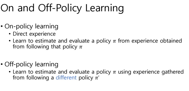 - On-policy learning : 움직이는 policy와 학습하는 policy가 같은 것 / 현재 Policy 위에서 control (prediction + policy improvement) 모두 하는 것