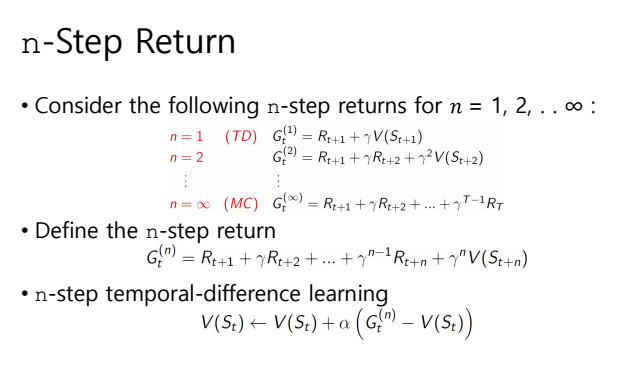 - ⇒ TD는 time-step마다 학습할 수 있는 장점은 있었지만 또한 bias가 높고 학습 정보가 별로 없기 때문에 TD와 MC의 장점을 둘 다 살리기 위한 방법으로 n-step TD !