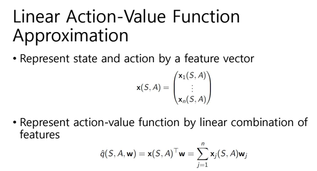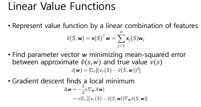 ⇒ "table로 작성하지 않고 w라는 새로운 변수를 사용하여 value function을 함수화하며, 이를 **value function approximation(= parameterizing value function)**이라고 한다. "
