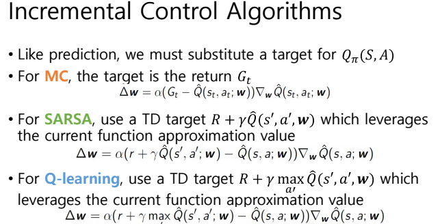 - SARSA에서는 Q(s) ⇒ TD target R+$\gamma$Q_hat(s,a,w)