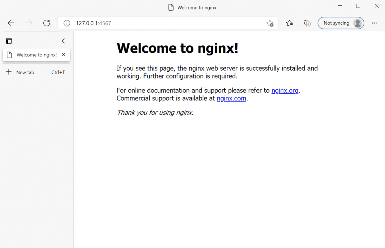 다시 웹 브라우저에서 127.0.0.1:4567에 접속해보면, 이제 ‘Welcome to nginx!’ 메시지가 나타납니다.