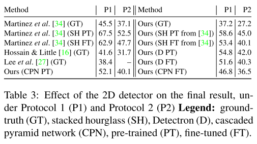 다음으로 2차원 키포인트 검출기가 최종 결과에 미치는 영향을 평가하였는데 아래 표3과 같이 GT 2D 자세, SH, Detectron 및 CPN에 대한 프로토콜 평가 결과는 아래와 같다.